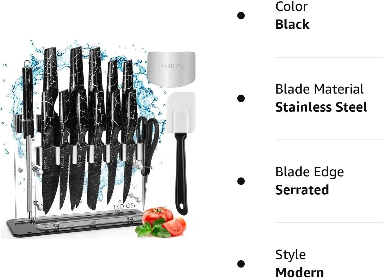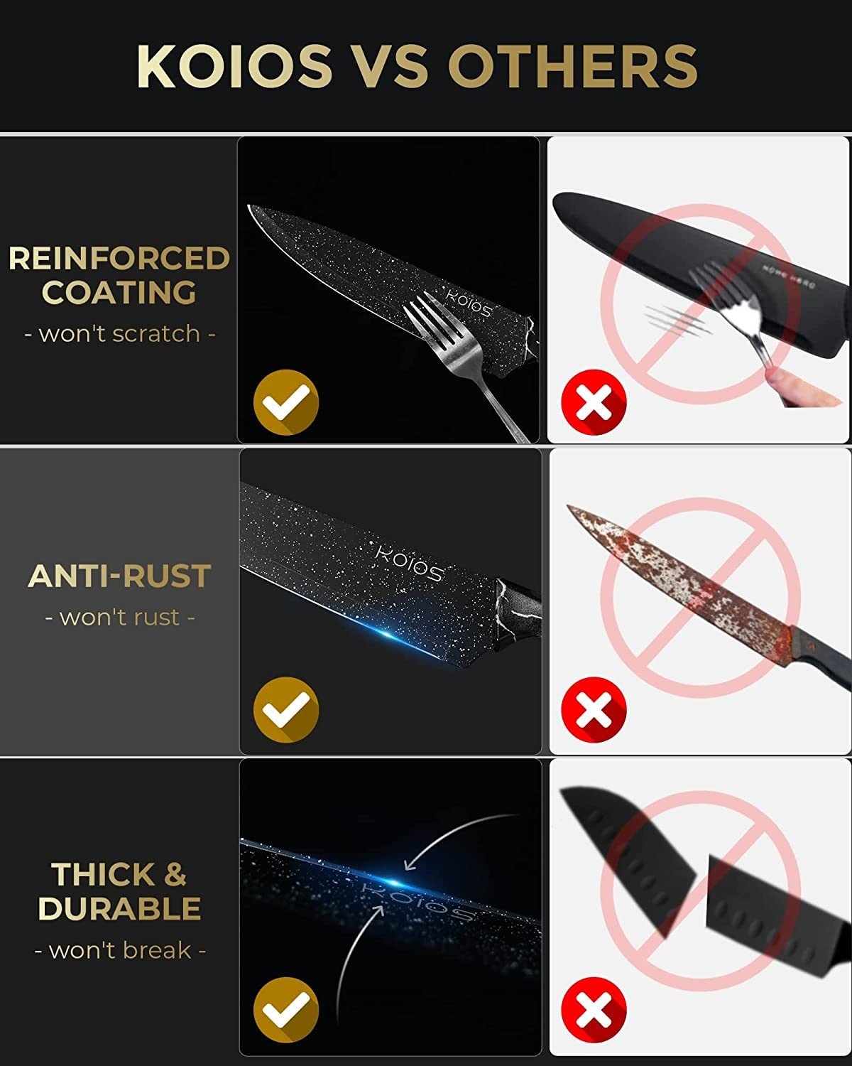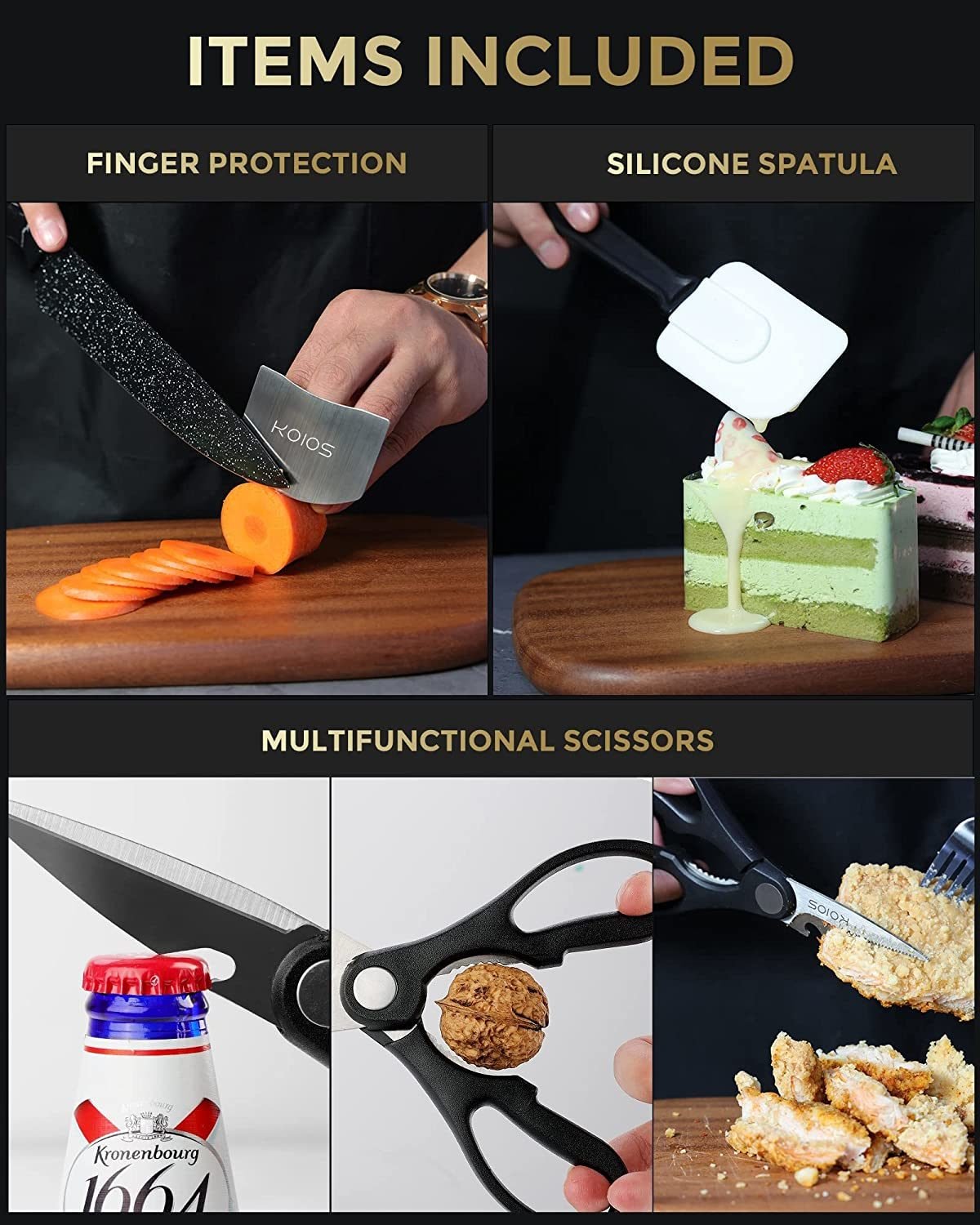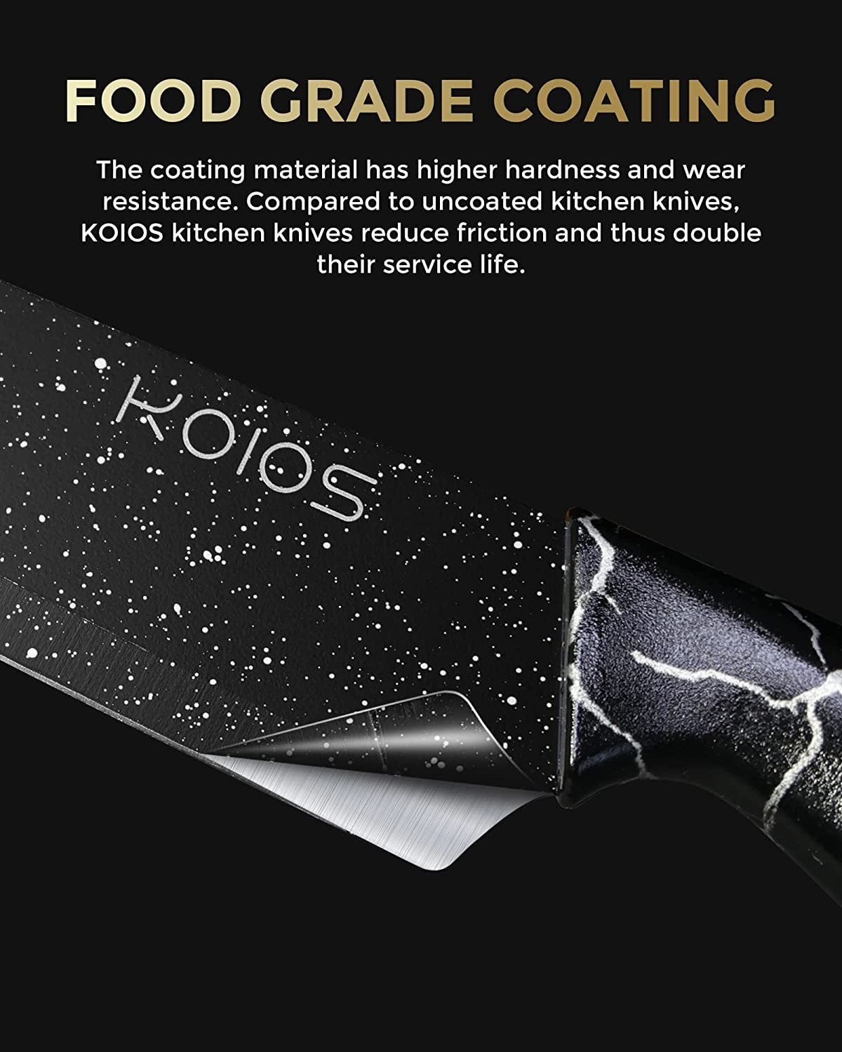 ✔About KOIOS:KOIOS brand has an extensive manufacturing expertise as well as professional R&D capabilities. Every item contributes to your lifestyle; thus we use high-quality stainless steel materials to provide customers with ultra-sharp; professional; and durable kitchen knife sets distinguished by elegance and sophistication.