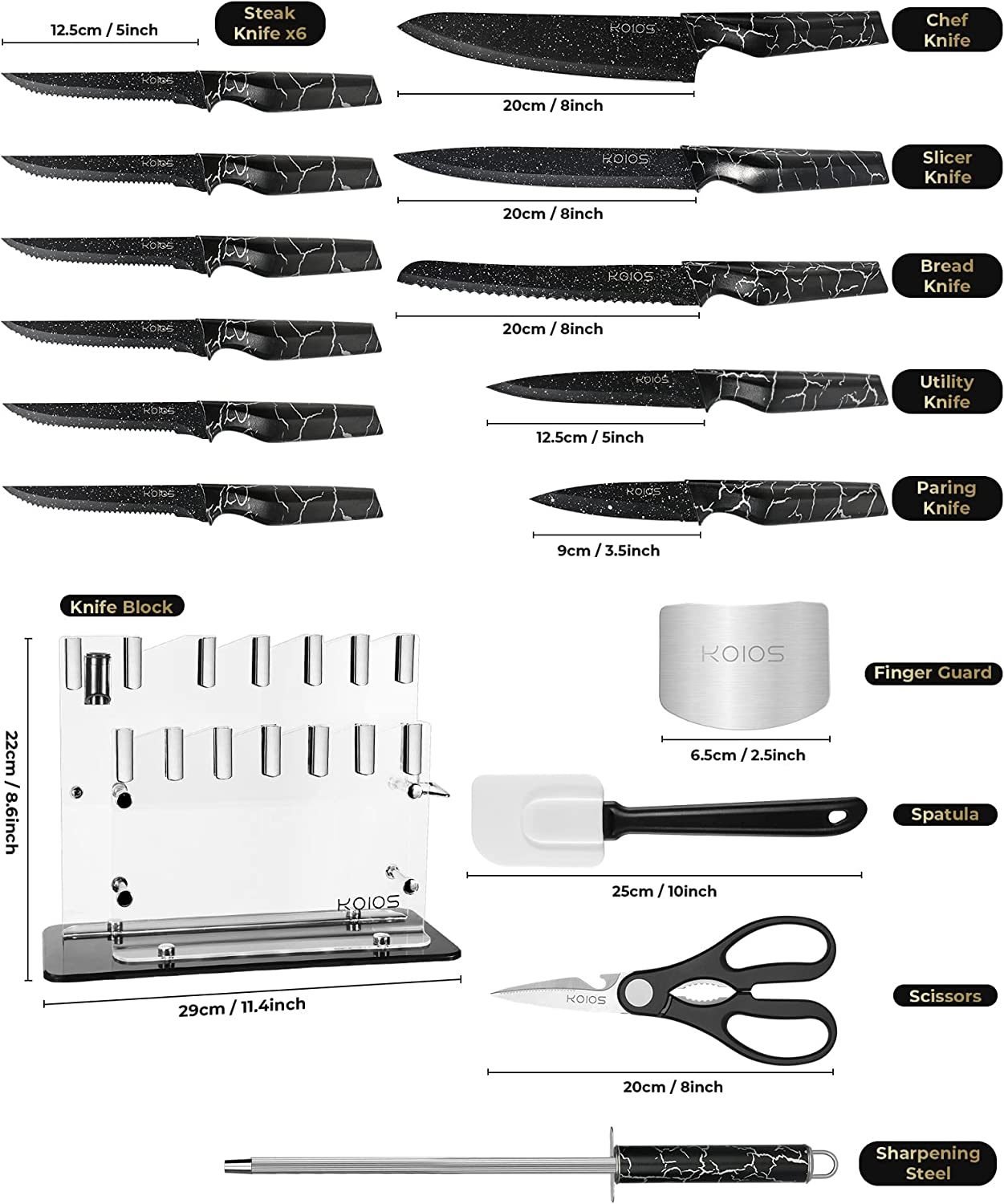 ✔Multipurpose:KOIOS 16PCS kitchen knives set include 8" chef knife; 8" slicing knife; 8" bread knife; 5" utility knife; 3.5" paring knife; 6PCS 5" steak knives; 1PCS spatula and scissors; finger guard; sharpening steel and acrylic stand. It can meet all your kitchen cooking needs. Add a touch of color to your kitchen now!