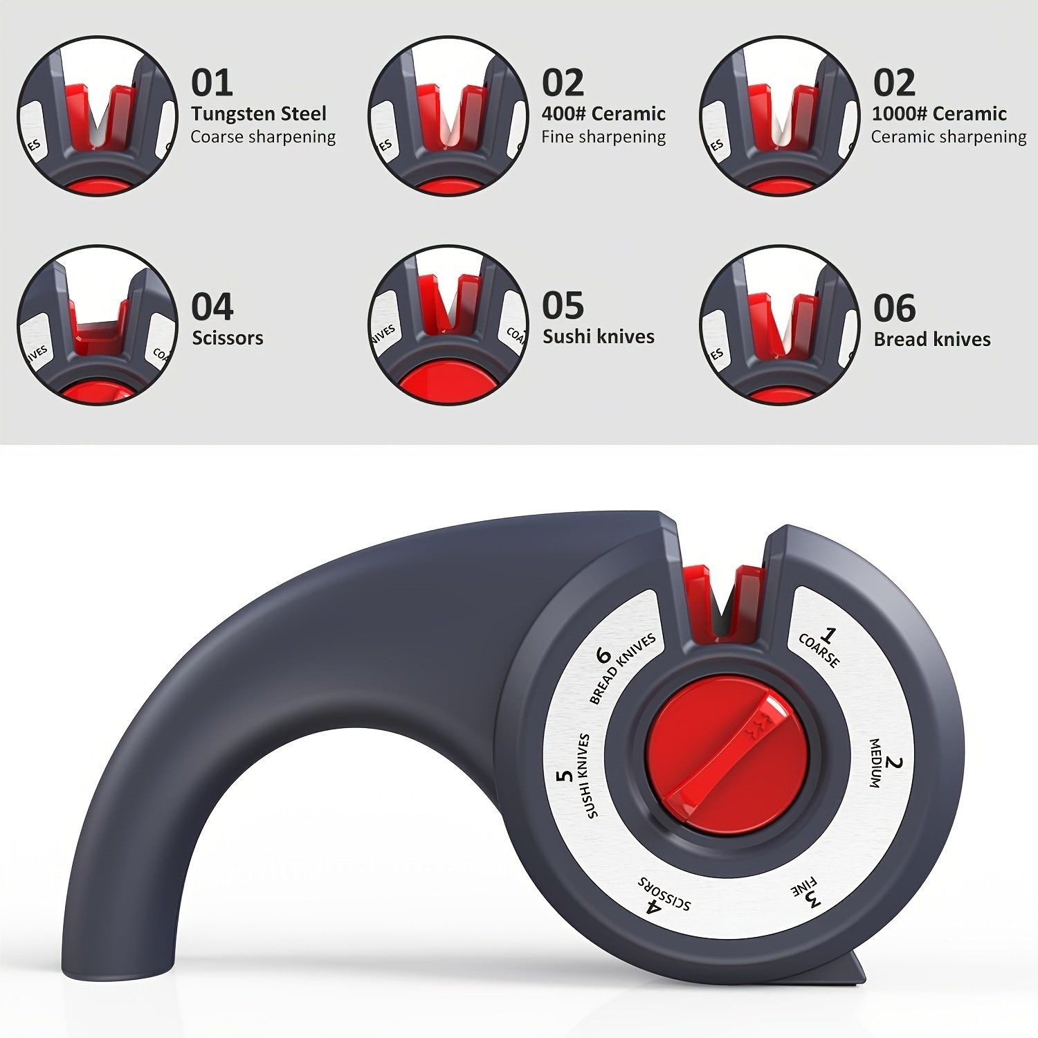 6-in-1 Multi-purpose Design Knife Sharpeners That Can Satisfy Different Sharpening Needs Such As Coarse Grinding; Fine Grinding And Precision Grinding Of Kitchen Knives As Well As Scissors; Bread Knives And Sushi Knives; Serrated And Steak Knives; Dull Hunting Knife; Serrated Knife; Blade; Machete.